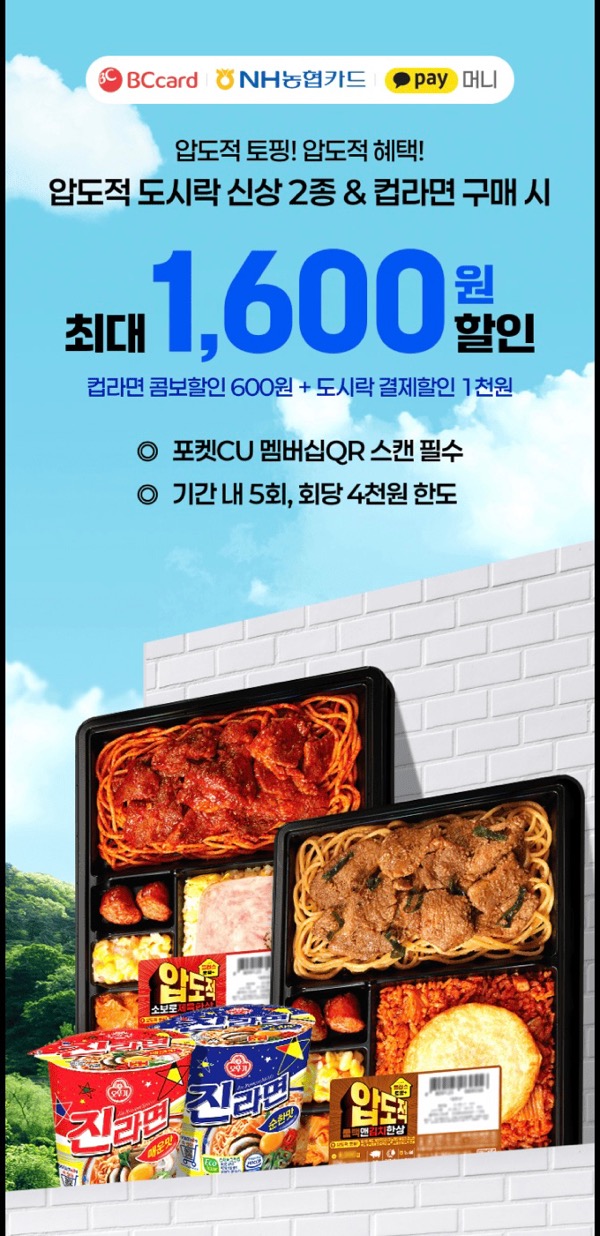 최대 1,600원 할인 (도시락 1,000원 + 컵라면 600원)이 적용된다는 거예요! 🤩