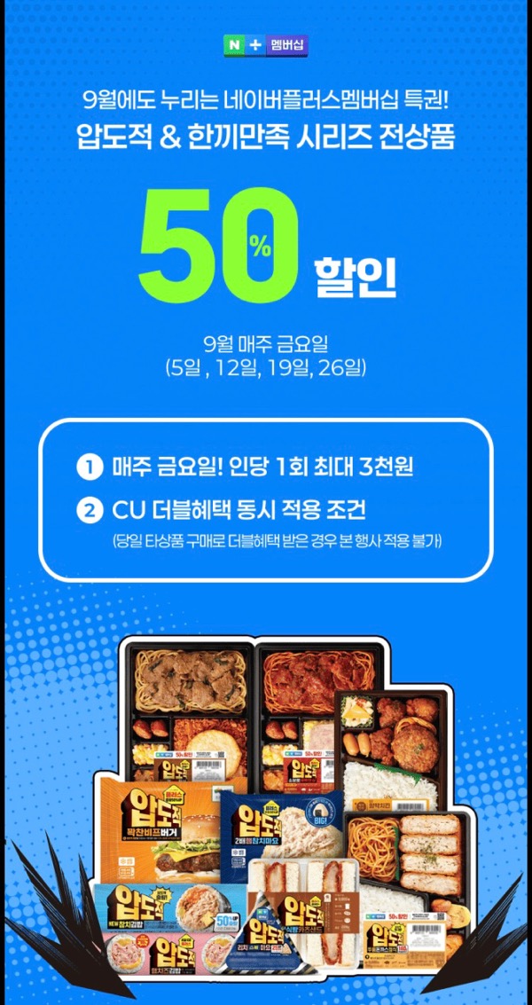 네이버플러스 멤버십 회원이라면 압도적 한끼민족 시리즈와 도시락을 무려 50% 할인된 가격에 구매할 수 있거든요.